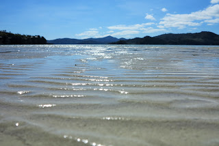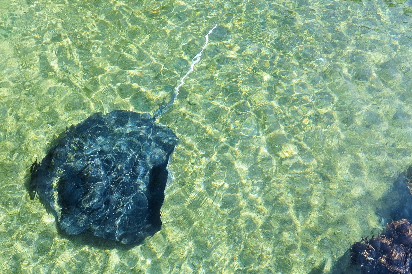 Depois da emoção inicial provocada pelo brinquedo, fomos para uma praia de areia muito fina. Uma raia veio até nós, parecendo usual por estas bandas.