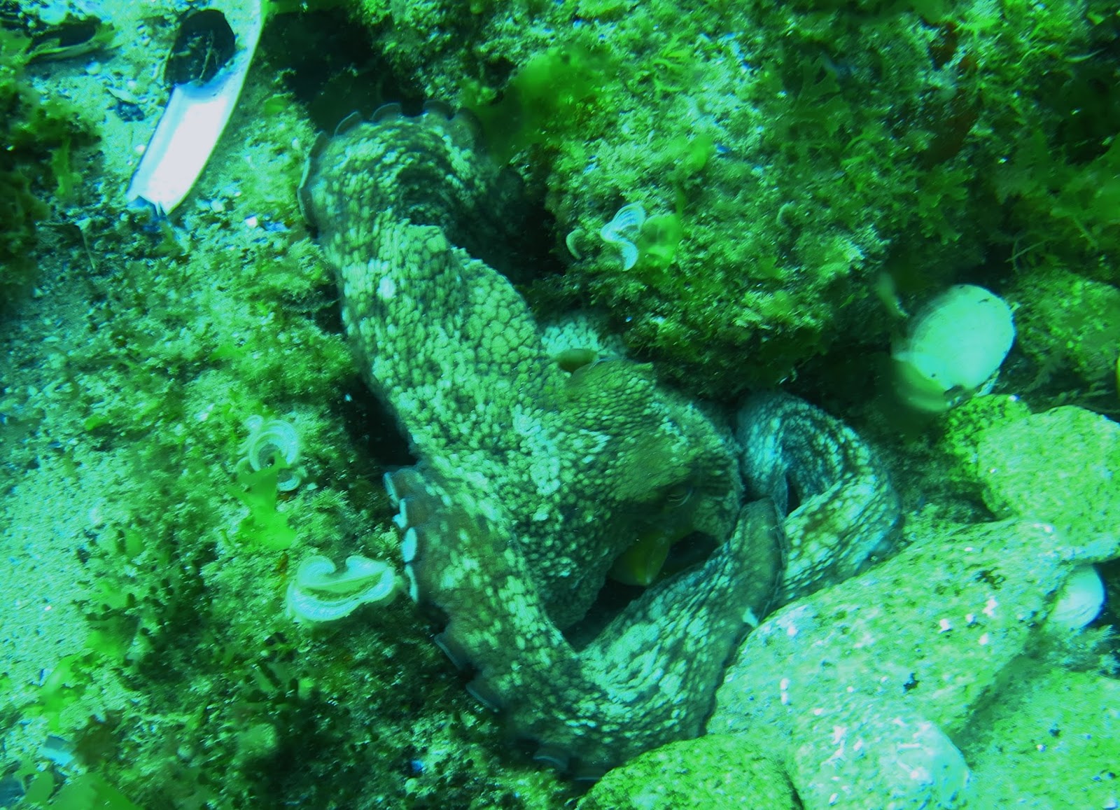 Excelente visibilidade, num autêntico jardim subaquático e polvo. Imensos polvos: pequenos e grandes, cheios de força agarrados às rochas e sem medo de nos enfrentarem. Nunca tinha visto tantos ao mesmo tempo; nem no supermercado.