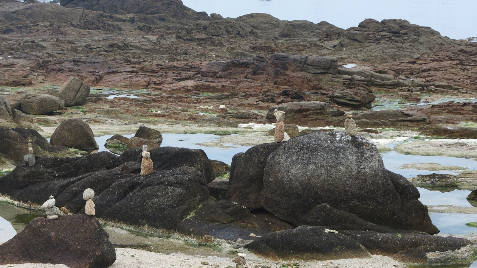 Ao fundo, numa ilha feita de rochas, um pequeno farol apareceu entre o nevoeiro; ao perto, como se de um altar se tratasse, em plena praia, pequenos montes de pedras encasteladas em cima umas das outras pareciam como figuras humanas.