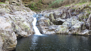 Um regato de água ao longe numa queda de água quase seca. Na descida, aproveitando a mobilidade da Transalp, meti-me por um caminho pedestre e fui dar à bacia da queda de água, ali no Rio Olo.