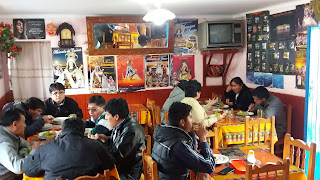 Tudo o que sobe tambem desce e, empurrados pelo frio, fomos ate a tipica Paucartambo, onde almocamos. Em cima do rio, numa casa de uma “mamy”, comemos uma sopa e carne acompanhada de batata doce e molho picante.